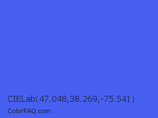 CIELab 47.048,38.269,-75.541 Color is a light blue color and the nearest color is Ultramarine Blue #4166f5. Hex code #4760f1 and RGB value is rgb(71,96,241). In RGB color space, this color is composed of 28% red, 38% green, 95% blue, In CMYK color space, this color is composed of 71% cyan, 60% magenta, 0% yellow , 5% black , In HSL color space, this color has a hue angle of 231° , 86% saturation and 61% lightness.
