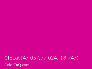 CIELab 47.057,77.024,-18.747 Color is a normal magenta color and the nearest color is Mexican Pink #e4007c. Hex code #d40191 and RGB value is rgb(212,1,145). In RGB color space, this color is composed of 83% red, 0% green, 57% blue, In CMYK color space, this color is composed of 0% cyan, 100% magenta, 32% yellow , 17% black , In HSL color space, this color has a hue angle of 319° , 99% saturation and 42% lightness.
