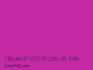 CIELab 47.072,70.228,-31.538 Color is a normal magenta color and the nearest color is Byzantine #bd33a4. Hex code #c429a6 and RGB value is rgb(196,41,166). In RGB color space, this color is composed of 77% red, 16% green, 65% blue, In CMYK color space, this color is composed of 0% cyan, 79% magenta, 15% yellow , 23% black , In HSL color space, this color has a hue angle of 312° , 65% saturation and 46% lightness.