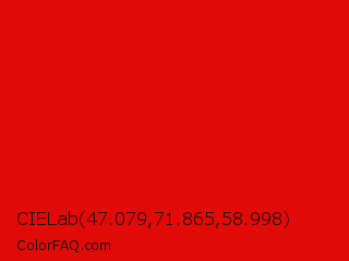 CIELab 47.079,71.865,58.998 Color is a normal red color and the nearest color is KU Crimson #e8000d. Hex code #e00a07 and RGB value is rgb(224,10,7). In RGB color space, this color is composed of 88% red, 4% green, 3% blue, In CMYK color space, this color is composed of 0% cyan, 96% magenta, 97% yellow , 12% black , In HSL color space, this color has a hue angle of 1° , 94% saturation and 45% lightness.