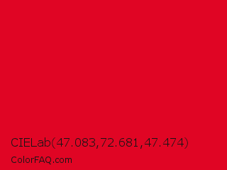CIELab 47.083,72.681,47.474 Color is a normal red color and the nearest color is Cadmium Red #e30022. Hex code #e00524 and RGB value is rgb(224,5,36). In RGB color space, this color is composed of 88% red, 2% green, 14% blue, In CMYK color space, this color is composed of 0% cyan, 98% magenta, 84% yellow , 12% black , In HSL color space, this color has a hue angle of 352° , 96% saturation and 45% lightness.