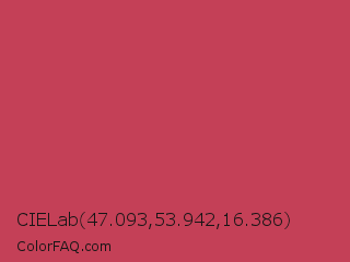 CIELab 47.093,53.942,16.386 Color is a normal red color and the nearest color is Brick Red #cb4154. Hex code #c44057 and RGB value is rgb(196,64,87). In RGB color space, this color is composed of 77% red, 25% green, 34% blue, In CMYK color space, this color is composed of 0% cyan, 67% magenta, 56% yellow , 23% black , In HSL color space, this color has a hue angle of 350° , 53% saturation and 51% lightness.