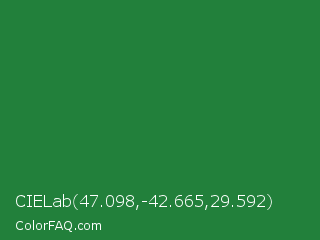 CIELab 47.098,-42.665,29.592 Color is a normal green color and the nearest color is Dark Spring Green #177245. Hex code #22803b and RGB value is rgb(34,128,59). In RGB color space, this color is composed of 13% red, 50% green, 23% blue, In CMYK color space, this color is composed of 73% cyan, 0% magenta, 54% yellow , 50% black , In HSL color space, this color has a hue angle of 136° , 58% saturation and 32% lightness.