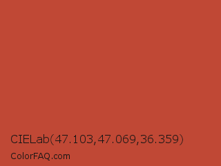 CIELab 47.103,47.069,36.359 Color is a normal red color and the nearest color is Mojo #c04737. Hex code #c04835 and RGB value is rgb(192,72,53). In RGB color space, this color is composed of 75% red, 28% green, 21% blue, In CMYK color space, this color is composed of 0% cyan, 63% magenta, 72% yellow , 25% black , In HSL color space, this color has a hue angle of 8° , 57% saturation and 48% lightness.