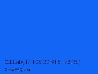 CIELab 47.105,32.916,-78.31 Color is a normal blue color and the nearest color is Blue Ribbon #0066ff. Hex code #1365f6 and RGB value is rgb(19,101,246). In RGB color space, this color is composed of 7% red, 40% green, 96% blue, In CMYK color space, this color is composed of 92% cyan, 59% magenta, 0% yellow , 4% black , In HSL color space, this color has a hue angle of 218° , 93% saturation and 52% lightness.