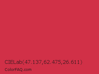 CIELab 47.137,62.475,26.611 Color is a normal red color and the nearest color is Rusty Red #da2c43. Hex code #d13047 and RGB value is rgb(209,48,71). In RGB color space, this color is composed of 82% red, 19% green, 28% blue, In CMYK color space, this color is composed of 0% cyan, 77% magenta, 66% yellow , 18% black , In HSL color space, this color has a hue angle of 351° , 64% saturation and 50% lightness.