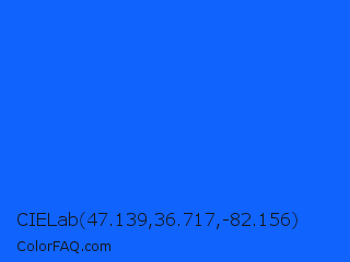 CIELab 47.139,36.717,-82.156 Color is a normal blue color and the nearest color is Blue Ribbon #0066ff. Hex code #1063fd and RGB value is rgb(16,99,253). In RGB color space, this color is composed of 6% red, 39% green, 99% blue, In CMYK color space, this color is composed of 94% cyan, 61% magenta, 0% yellow , 1% black , In HSL color space, this color has a hue angle of 219° , 98% saturation and 53% lightness.