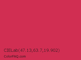 CIELab 47.13,63.7,19.902 Color is a normal red color and the nearest color is Dingy Dungeon #c53151. Hex code #d12e52 and RGB value is rgb(209,46,82). In RGB color space, this color is composed of 82% red, 18% green, 32% blue, In CMYK color space, this color is composed of 0% cyan, 78% magenta, 61% yellow , 18% black , In HSL color space, this color has a hue angle of 347° , 64% saturation and 50% lightness.