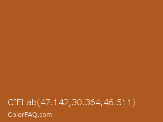 CIELab 47.142,30.364,46.511 Color is a normal orange color and the nearest color is Desert #ae6020. Hex code #ad591f and RGB value is rgb(173,89,31). In RGB color space, this color is composed of 68% red, 35% green, 12% blue, In CMYK color space, this color is composed of 0% cyan, 49% magenta, 82% yellow , 32% black , In HSL color space, this color has a hue angle of 25° , 70% saturation and 40% lightness.