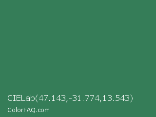 CIELab 47.143,-31.774,13.543 Color is a normal green color and the nearest color is Amazon #3b7a57. Hex code #357d58 and RGB value is rgb(53,125,88). In RGB color space, this color is composed of 21% red, 49% green, 35% blue, In CMYK color space, this color is composed of 58% cyan, 0% magenta, 30% yellow , 51% black , In HSL color space, this color has a hue angle of 149° , 40% saturation and 35% lightness.