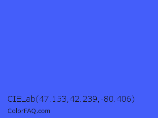 CIELab 47.153,42.239,-80.406 Color is a light blue color and the nearest color is Ultramarine Blue #4166f5. Hex code #445efa and RGB value is rgb(68,94,250). In RGB color space, this color is composed of 27% red, 37% green, 98% blue, In CMYK color space, this color is composed of 73% cyan, 62% magenta, 0% yellow , 2% black , In HSL color space, this color has a hue angle of 231° , 95% saturation and 62% lightness.