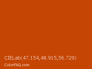 CIELab 47.154,48.915,56.729 Color is a normal orange color and the nearest color is Mahogany #c04000. Hex code #c54505 and RGB value is rgb(197,69,5). In RGB color space, this color is composed of 77% red, 27% green, 2% blue, In CMYK color space, this color is composed of 0% cyan, 65% magenta, 97% yellow , 23% black , In HSL color space, this color has a hue angle of 20° , 95% saturation and 40% lightness.