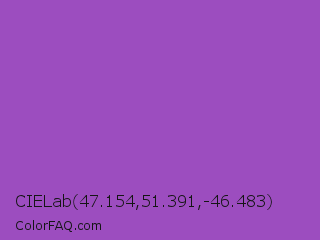 CIELab 47.154,51.391,-46.483 Color is a normal purple color and the nearest color is Deep Lilac #9955bb. Hex code #9c4dbf and RGB value is rgb(156,77,191). In RGB color space, this color is composed of 61% red, 30% green, 75% blue, In CMYK color space, this color is composed of 18% cyan, 60% magenta, 0% yellow , 25% black , In HSL color space, this color has a hue angle of 282° , 47% saturation and 53% lightness.
