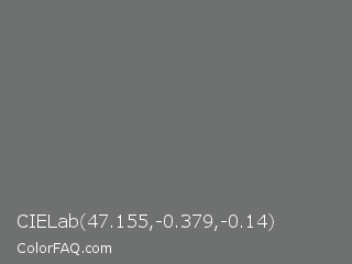 CIELab 47.155,-0.379,-0.14 Color is a normal cyan color and the nearest color is Nickel #727472. Hex code #6f7070 and RGB value is rgb(111,112,112). In RGB color space, this color is composed of 44% red, 44% green, 44% blue, In CMYK color space, this color is composed of 1% cyan, 0% magenta, 0% yellow , 56% black , In HSL color space, this color has a hue angle of 180° , 0% saturation and 44% lightness.