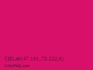 CIELab 47.161,73.222,6 Color is a normal rose color and the nearest color is Dogwood Rose #d71868. Hex code #d91069 and RGB value is rgb(217,16,105). In RGB color space, this color is composed of 85% red, 6% green, 41% blue, In CMYK color space, this color is composed of 0% cyan, 93% magenta, 52% yellow , 15% black , In HSL color space, this color has a hue angle of 333° , 86% saturation and 46% lightness.