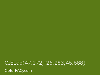 CIELab 47.172,-26.283,46.688 Color is a dark lime color and the nearest color is Fern Frond #657220. Hex code #5a7a16 and RGB value is rgb(90,122,22). In RGB color space, this color is composed of 35% red, 48% green, 9% blue, In CMYK color space, this color is composed of 26% cyan, 0% magenta, 82% yellow , 52% black , In HSL color space, this color has a hue angle of 79° , 69% saturation and 28% lightness.