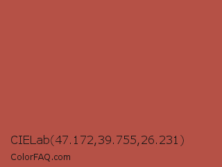 CIELab 47.172,39.755,26.231 Color is a normal red color and the nearest color is Deep Chestnut #b94e48. Hex code #b55146 and RGB value is rgb(181,81,70). In RGB color space, this color is composed of 71% red, 32% green, 27% blue, In CMYK color space, this color is composed of 0% cyan, 55% magenta, 61% yellow , 29% black , In HSL color space, this color has a hue angle of 6° , 44% saturation and 49% lightness.