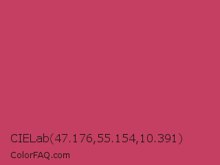 CIELab 47.176,55.154,10.391 Color is a normal red color and the nearest color is Brick Red #cb4154. Hex code #c43f61 and RGB value is rgb(196,63,97). In RGB color space, this color is composed of 77% red, 25% green, 38% blue, In CMYK color space, this color is composed of 0% cyan, 68% magenta, 51% yellow , 23% black , In HSL color space, this color has a hue angle of 345° , 53% saturation and 51% lightness.