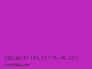 CIELab 47.183,73.176,-46.137 Color is a normal magenta color and the nearest color is Steel Pink #cc33cc. Hex code #be27bf and RGB value is rgb(190,39,191). In RGB color space, this color is composed of 75% red, 15% green, 75% blue, In CMYK color space, this color is composed of 1% cyan, 80% magenta, 0% yellow , 25% black , In HSL color space, this color has a hue angle of 300° , 66% saturation and 45% lightness.