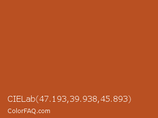 CIELab 47.193,39.938,45.893 Color is a normal orange color and the nearest color is Orange Roughy #c45719. Hex code #b95022 and RGB value is rgb(185,80,34). In RGB color space, this color is composed of 73% red, 31% green, 13% blue, In CMYK color space, this color is composed of 0% cyan, 57% magenta, 82% yellow , 27% black , In HSL color space, this color has a hue angle of 18° , 69% saturation and 43% lightness.