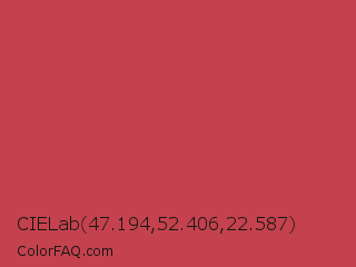 CIELab 47.194,52.406,22.587 Color is a normal red color and the nearest color is English Vermillion #cc474b. Hex code #c4424d and RGB value is rgb(196,66,77). In RGB color space, this color is composed of 77% red, 26% green, 30% blue, In CMYK color space, this color is composed of 0% cyan, 66% magenta, 61% yellow , 23% black , In HSL color space, this color has a hue angle of 355° , 52% saturation and 51% lightness.