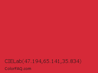 CIELab 47.194,65.141,35.834 Color is a normal red color and the nearest color is Rusty Red #da2c43. Hex code #d62938 and RGB value is rgb(214,41,56). In RGB color space, this color is composed of 84% red, 16% green, 22% blue, In CMYK color space, this color is composed of 0% cyan, 81% magenta, 74% yellow , 16% black , In HSL color space, this color has a hue angle of 355° , 68% saturation and 50% lightness.