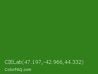 CIELab 47.197,-42.966,44.332 Color is a dark green color and the nearest color is Bilbao #327c14. Hex code #31801b and RGB value is rgb(49,128,27). In RGB color space, this color is composed of 19% red, 50% green, 11% blue, In CMYK color space, this color is composed of 62% cyan, 0% magenta, 79% yellow , 50% black , In HSL color space, this color has a hue angle of 107° , 65% saturation and 30% lightness.