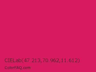 CIELab 47.213,70.962,11.612 Color is a normal rose color and the nearest color is Dogwood Rose #d71868. Hex code #d81a60 and RGB value is rgb(216,26,96). In RGB color space, this color is composed of 85% red, 10% green, 38% blue, In CMYK color space, this color is composed of 0% cyan, 88% magenta, 56% yellow , 15% black , In HSL color space, this color has a hue angle of 338° , 79% saturation and 47% lightness.