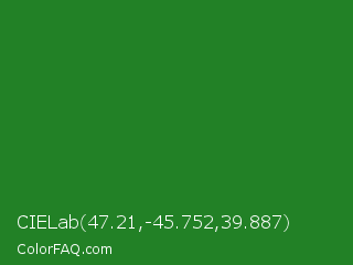 CIELab 47.21,-45.752,39.887 Color is a normal green color and the nearest color is Forest Green #228b22. Hex code #228126 and RGB value is rgb(34,129,38). In RGB color space, this color is composed of 13% red, 51% green, 15% blue, In CMYK color space, this color is composed of 74% cyan, 0% magenta, 71% yellow , 49% black , In HSL color space, this color has a hue angle of 123° , 58% saturation and 32% lightness.