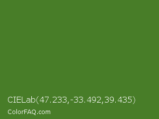 CIELab 47.233,-33.492,39.435 Color is a normal green color and the nearest color is Sap Green #507d2a. Hex code #487d28 and RGB value is rgb(72,125,40). In RGB color space, this color is composed of 28% red, 49% green, 16% blue, In CMYK color space, this color is composed of 42% cyan, 0% magenta, 68% yellow , 51% black , In HSL color space, this color has a hue angle of 97° , 52% saturation and 32% lightness.