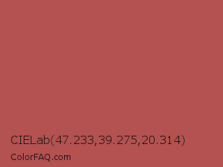 CIELab 47.233,39.275,20.314 Color is a normal red color and the nearest color is Rose Vale #ab4e52. Hex code #b35250 and RGB value is rgb(179,82,80). In RGB color space, this color is composed of 70% red, 32% green, 31% blue, In CMYK color space, this color is composed of 0% cyan, 54% magenta, 55% yellow , 30% black , In HSL color space, this color has a hue angle of 1° , 39% saturation and 51% lightness.