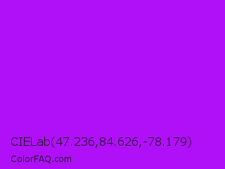 CIELab 47.236,84.626,-78.179 Color is a normal purple color and the nearest color is Vivid Mulberry #b80ce3. Hex code #af10f7 and RGB value is rgb(175,16,247). In RGB color space, this color is composed of 69% red, 6% green, 97% blue, In CMYK color space, this color is composed of 29% cyan, 94% magenta, 0% yellow , 3% black , In HSL color space, this color has a hue angle of 281° , 94% saturation and 52% lightness.