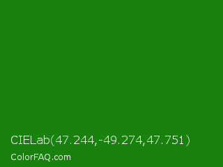 CIELab 47.244,-49.274,47.751 Color is a dark green color and the nearest color is India Green #138808. Hex code #19820f and RGB value is rgb(25,130,15). In RGB color space, this color is composed of 10% red, 51% green, 6% blue, In CMYK color space, this color is composed of 81% cyan, 0% magenta, 88% yellow , 49% black , In HSL color space, this color has a hue angle of 115° , 79% saturation and 28% lightness.