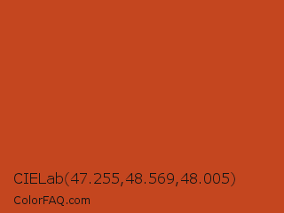 CIELab 47.255,48.569,48.005 Color is a normal red color and the nearest color is Dark Pastel Red #c23b22. Hex code #c4461f and RGB value is rgb(196,70,31). In RGB color space, this color is composed of 77% red, 27% green, 12% blue, In CMYK color space, this color is composed of 0% cyan, 64% magenta, 84% yellow , 23% black , In HSL color space, this color has a hue angle of 14° , 73% saturation and 45% lightness.