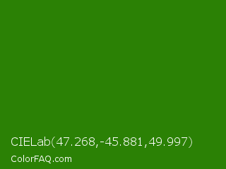 CIELab 47.268,-45.881,49.997 Color is a dark green color and the nearest color is Napier Green #2a8000. Hex code #2b8105 and RGB value is rgb(43,129,5). In RGB color space, this color is composed of 17% red, 51% green, 2% blue, In CMYK color space, this color is composed of 67% cyan, 0% magenta, 96% yellow , 49% black , In HSL color space, this color has a hue angle of 102° , 93% saturation and 26% lightness.