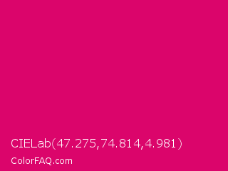 CIELab 47.275,74.814,4.981 Color is a normal rose color and the nearest color is Red Purple #e40078. Hex code #db056b and RGB value is rgb(219,5,107). In RGB color space, this color is composed of 86% red, 2% green, 42% blue, In CMYK color space, this color is composed of 0% cyan, 98% magenta, 51% yellow , 14% black , In HSL color space, this color has a hue angle of 331° , 96% saturation and 44% lightness.