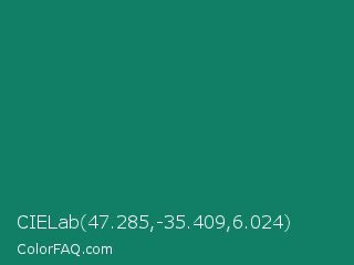 CIELab 47.285,-35.409,6.024 Color is a dark cyan color and the nearest color is Deep Green Cyan Turquoise #0e7c61. Hex code #117f65 and RGB value is rgb(17,127,101). In RGB color space, this color is composed of 7% red, 50% green, 40% blue, In CMYK color space, this color is composed of 87% cyan, 0% magenta, 20% yellow , 50% black , In HSL color space, this color has a hue angle of 166° , 76% saturation and 28% lightness.
