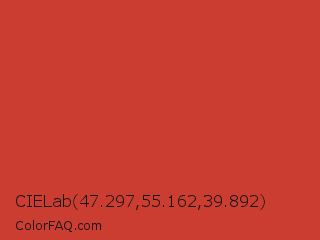 CIELab 47.297,55.162,39.892 Color is a normal red color and the nearest color is Flush Mahogany #ca3435. Hex code #cb3d30 and RGB value is rgb(203,61,48). In RGB color space, this color is composed of 80% red, 24% green, 19% blue, In CMYK color space, this color is composed of 0% cyan, 70% magenta, 76% yellow , 20% black , In HSL color space, this color has a hue angle of 5° , 62% saturation and 49% lightness.
