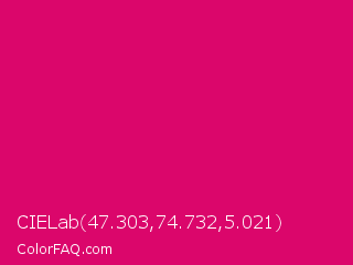 CIELab 47.303,74.732,5.021 Color is a normal rose color and the nearest color is Raspberry #e30b5d. Hex code #db066b and RGB value is rgb(219,6,107). In RGB color space, this color is composed of 86% red, 2% green, 42% blue, In CMYK color space, this color is composed of 0% cyan, 97% magenta, 51% yellow , 14% black , In HSL color space, this color has a hue angle of 332° , 95% saturation and 44% lightness.