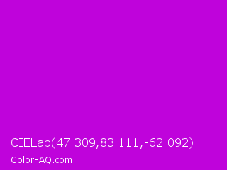 CIELab 47.309,83.111,-62.092 Color is a normal magenta color and the nearest color is Vivid Mulberry #b80ce3. Hex code #bf03db and RGB value is rgb(191,3,219). In RGB color space, this color is composed of 75% red, 1% green, 86% blue, In CMYK color space, this color is composed of 13% cyan, 99% magenta, 0% yellow , 14% black , In HSL color space, this color has a hue angle of 292° , 97% saturation and 44% lightness.