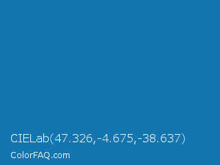 CIELab 47.326,-4.675,-38.637 Color is a normal blue color and the nearest color is Green Blue #1164b4. Hex code #1376b1 and RGB value is rgb(19,118,177). In RGB color space, this color is composed of 7% red, 46% green, 69% blue, In CMYK color space, this color is composed of 89% cyan, 33% magenta, 0% yellow , 31% black , In HSL color space, this color has a hue angle of 202° , 81% saturation and 38% lightness.