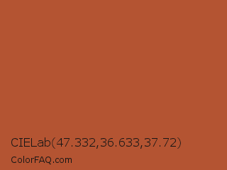 CIELab 47.332,36.633,37.72 Color is a normal orange color and the nearest color is Brown Rust #af593e. Hex code #b45432 and RGB value is rgb(180,84,50). In RGB color space, this color is composed of 71% red, 33% green, 20% blue, In CMYK color space, this color is composed of 0% cyan, 53% magenta, 72% yellow , 29% black , In HSL color space, this color has a hue angle of 16° , 57% saturation and 45% lightness.