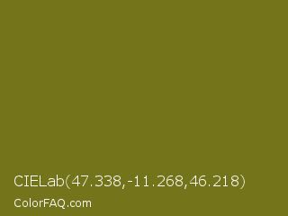 CIELab 47.338,-11.268,46.218 Color is a dark yellow color and the nearest color is Olivetone #716e10. Hex code #74741a and RGB value is rgb(116,116,26). In RGB color space, this color is composed of 45% red, 45% green, 10% blue, In CMYK color space, this color is composed of 0% cyan, 0% magenta, 78% yellow , 55% black , In HSL color space, this color has a hue angle of 60° , 63% saturation and 28% lightness.