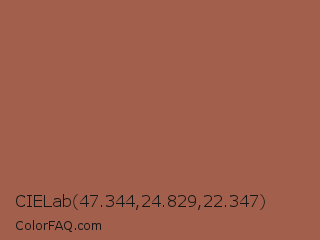 CIELab 47.344,24.829,22.347 Color is a normal red color and the nearest color is Redwood #a45a52. Hex code #a15f4c and RGB value is rgb(161,95,76). In RGB color space, this color is composed of 63% red, 37% green, 30% blue, In CMYK color space, this color is composed of 0% cyan, 41% magenta, 53% yellow , 37% black , In HSL color space, this color has a hue angle of 13° , 36% saturation and 46% lightness.