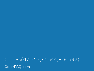 CIELab 47.353,-4.544,-38.592 Color is a normal blue color and the nearest color is Green Blue #1164b4. Hex code #1576b1 and RGB value is rgb(21,118,177). In RGB color space, this color is composed of 8% red, 46% green, 69% blue, In CMYK color space, this color is composed of 88% cyan, 33% magenta, 0% yellow , 31% black , In HSL color space, this color has a hue angle of 203° , 79% saturation and 39% lightness.