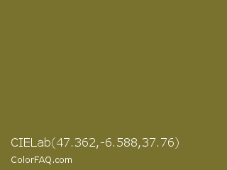 CIELab 47.362,-6.588,37.76 Color is a normal yellow color and the nearest color is Pesto #7c7631. Hex code #79722e and RGB value is rgb(121,114,46). In RGB color space, this color is composed of 47% red, 45% green, 18% blue, In CMYK color space, this color is composed of 0% cyan, 6% magenta, 62% yellow , 53% black , In HSL color space, this color has a hue angle of 54° , 45% saturation and 33% lightness.