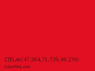 CIELab 47.364,71.739,49.239 Color is a normal red color and the nearest color is Medium Candy Apple Red #e2062c. Hex code #e00f21 and RGB value is rgb(224,15,33). In RGB color space, this color is composed of 88% red, 6% green, 13% blue, In CMYK color space, this color is composed of 0% cyan, 93% magenta, 85% yellow , 12% black , In HSL color space, this color has a hue angle of 355° , 87% saturation and 47% lightness.
