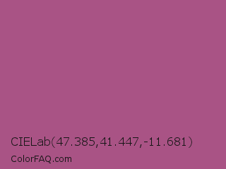 CIELab 47.385,41.447,-11.681 Color is a normal magenta color and the nearest color is Tapestry #b05e81. Hex code #a95385 and RGB value is rgb(169,83,133). In RGB color space, this color is composed of 66% red, 33% green, 52% blue, In CMYK color space, this color is composed of 0% cyan, 51% magenta, 21% yellow , 34% black , In HSL color space, this color has a hue angle of 325° , 34% saturation and 49% lightness.