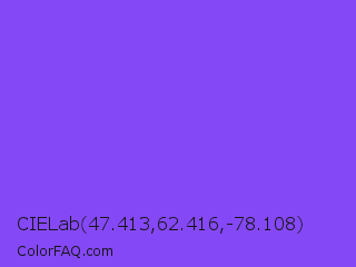 CIELab 47.413,62.416,-78.108 Color is a light violet color and the nearest color is Navy Purple #9457eb. Hex code #8548f7 and RGB value is rgb(133,72,247). In RGB color space, this color is composed of 52% red, 28% green, 97% blue, In CMYK color space, this color is composed of 46% cyan, 71% magenta, 0% yellow , 3% black , In HSL color space, this color has a hue angle of 261° , 92% saturation and 63% lightness.