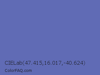 CIELab 47.415,16.017,-40.624 Color is a normal blue color and the nearest color is Scampi #675fa6. Hex code #606bb5 and RGB value is rgb(96,107,181). In RGB color space, this color is composed of 38% red, 42% green, 71% blue, In CMYK color space, this color is composed of 47% cyan, 41% magenta, 0% yellow , 29% black , In HSL color space, this color has a hue angle of 232° , 36% saturation and 54% lightness.